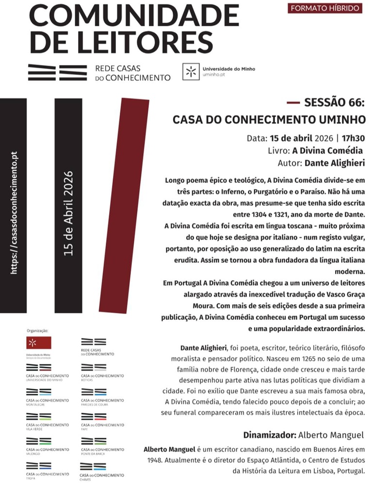 O prestigiado escritor e bibliófilo Alberto Manguel é o convidado especial da Comunidade de Leitores da Rede Casas do Conhecimento nesta quarta-feira, às 17h30. O encontro, que terá lugar na Biblioteca Geral da Universidade do Minho (UMinho), em Braga, focar-se-á na análise da obra clássica “A Divina Comédia”, de Dante Alighieri.