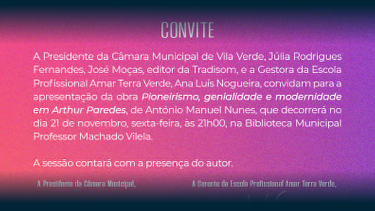A Biblioteca Municipal Professor Machado Vilela, em Vila Verde, será palco de uma sessão cultural no dia 21, sexta-feira, às 21h00, com a apresentação do livro “Pioneirismo, genialidade e modernidade em Artur Paredes”. O evento insere-se no Projeto AQUI HÁ CULTURA!, uma iniciativa da Câmara Municipal de Vila Verde em parceria com a Escola Profissional Amar Terra Verde, informa uma nota enviada à comunicação social.