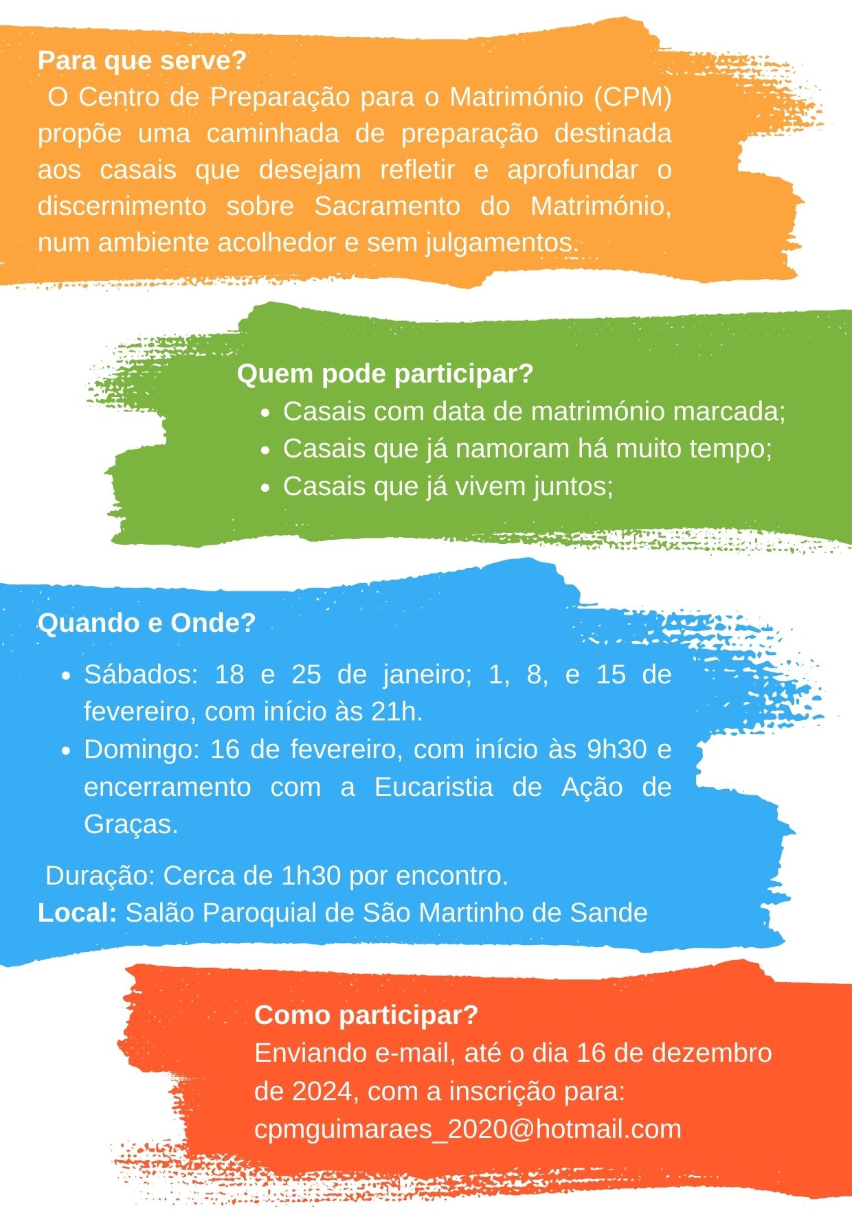 Os interessados em participar, podem solicitar todas as informações através do e-mail cpmguimaraes_2020@hotmail.com ou junto do respetivo pároco. As inscrições decorrem até ao dia 16 de dezembro.
