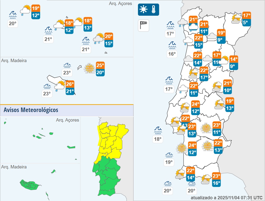 Esta terça-feira 11 distritos estarão sob Aviso Amarelo. No interior por causa da intensidade do vento e no litoral pelo vento e agitação marítima. O aviso amarelo entra em vigor a partir das 21h00 de hoje, dia 4 e extende-se até cerca das 12h00 de amanhã, quarta-feira dia 5.