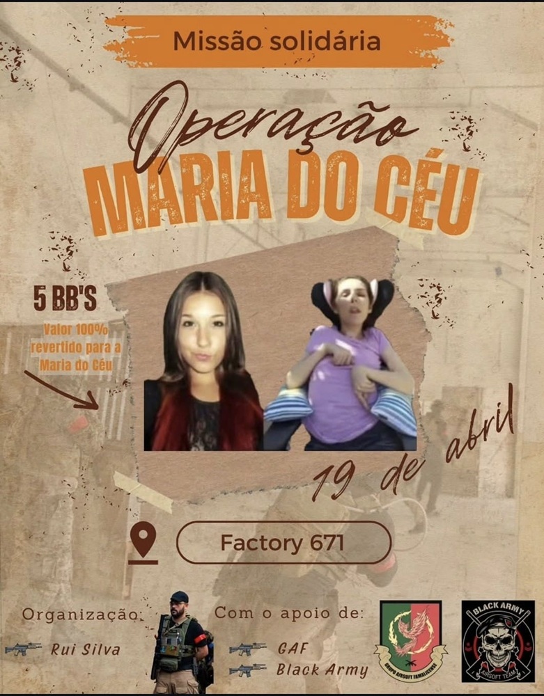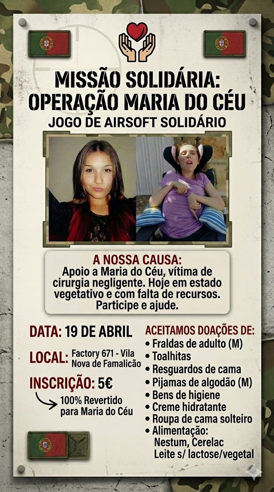 A família de Maria do Céu receberá o apoio direto da comunidade de Airsoft, no domingo, dia 19, fruto de um evento solidário realizado na antiga Reguladora, em Vila Nova de Famalicão. A iniciativa, organizada por Rui Silva com o apoio da equipa Black Army, mobiliza cerca de 90 participantes de vários pontos do Norte do país para apoiar a jovem de 29 anos, que vive com 99% de incapacidade após uma alegada negligência médica.