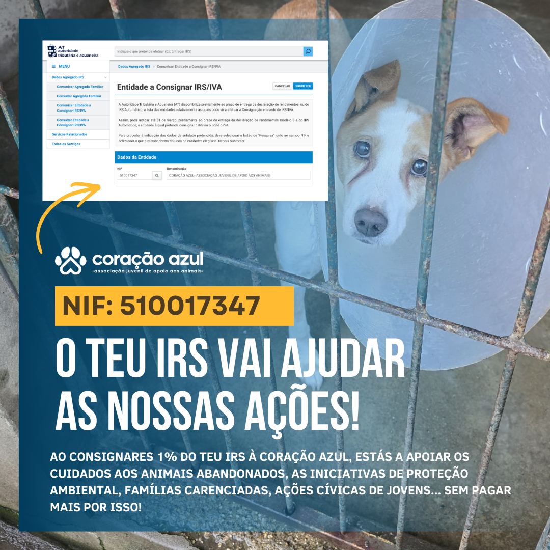 A Coração Azul – Associação Juvenil de Apoio aos Animais lançou esta semana um apelo público aos contribuintes portugueses para que ajudem a financiar as suas operações diárias através da consignação do IRS. Sob o mote “Transforme o seu IRS em amor que salva vidas”, a associação pretende angariar fundos fundamentais para manter o apoio a animais em situações vulneráveis ou feridos.